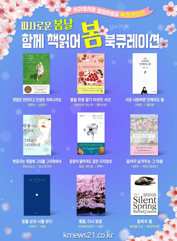 지난해 10월부터 ‘ 인간관계, 가족, 재테크, 뇌과학, 추리, 건강 ’ 등 다양한 주제로 북큐레이션을 시작해 3월에는 ‘제주 4·3’을 기억하는 시간, 4월에는 ‘따사로운 봄날 함께 책 읽어 봄’이라는 주제로 ‘침묵의 봄, 서로 사랑하면 언제라도 봄’등 총 9권을 선정했다.