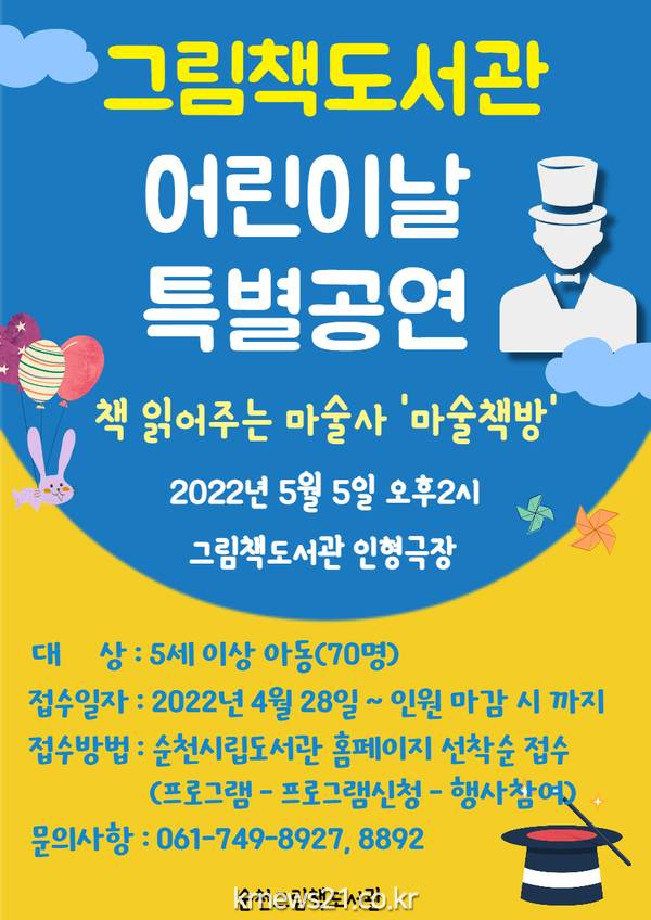 공연은 5세 이상의 아동부터 관람할 수 있으며, 오는 28일부터 순천시립도서관 홈페이지를 통해 선착순 70명을 모집한다. 공연 관람료는 무료이며, 이날 기존 인형극 ‘쪼꼬미 나라의 봄이’는 상연하지 않는다.