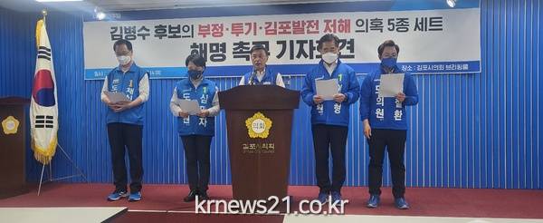 정하영 민주당 김포시장 후보가 ‘김병수 5대 핵심 의혹 해명 촉구 기자회견’을 개최했다.