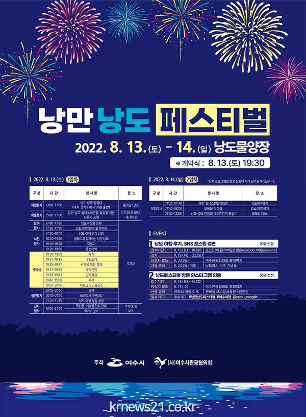 시 관계자는 “이번 페스티벌이 그동안 낭도에서 진행한 생태녹색관광 육성사업의 성과를 공유하는 자리가 될 것으로 생각한다. 섬 주민에게는 활력을, 관광객에게는 즐거움을 선사하는 낭만 페스티벌이 되기를 바란다”며 “방역과 안전대책에도 최선을 다하겠다”고 전했다.