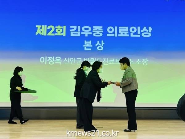 전남 신안군(군수 박우량)은 지난 9일 서울 연세대학교 김우중 기념관에서 열린 ‘제2회 김우중 의료인상 시상식’에서 신안군보건소 이정옥 반월도 보건진료소장(사진)이 수상의 영예를 안았다고 밝혔다.