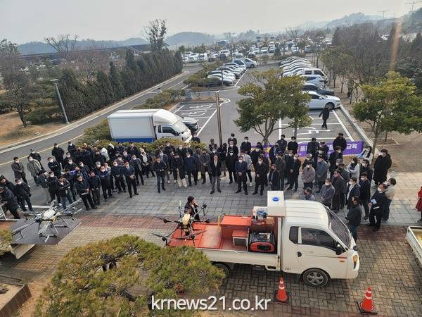 드론 이착륙시설은 1톤 화물차에 드론을 고정하여 기존 2인 1조 드론방제에서 벗어나 혼자서도 방제가 가능하도록 하였으며, 이는 힘든 육체노동 및 농촌 일손부족 해결에 도움을 줄 뿐만 아니라 이동 중 배터리 충전도 가능하여 1일 방제가능 면적확대에 따라 농가의 일손을 덜어주는데 크게 기여할 것으로 예상된다.