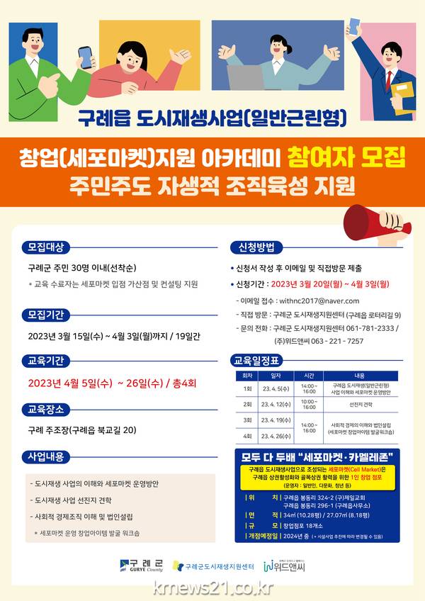 ▲ 구례군, 도시재생‘창업(세포마켓) 지원 아카데미’참여자 모집전남 구례군은 구례읍 도시재생사업(일반 근린형)으로‘창업(세포마켓)지원 아카데미’참여자를 모집한다.