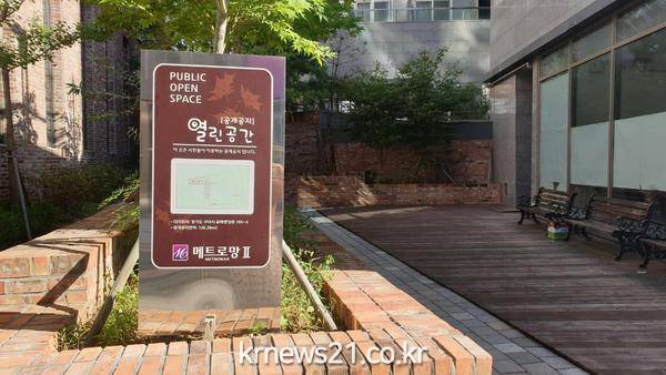 ‘공개공지’란 쾌적한 도시환경 및 보행환경을 확보하고 문화공간으로 이용 활성화를 도모하기 위해 문화 및 집회시설, 판매시설, 숙박시설, 업무시설, 의료시설 등 연면적 합계 5,000㎡ 이상인 다중이용 건축물 부지에 일반시민이 자유롭게 이용할 수 있도록 설치된 소규모 휴식 공간이다.