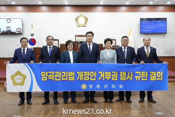 장흥군의회(의장 왕윤채) 유금렬 의원(산업경제위원장)이 제281회 임시회 제1차 본회의에서 ‘양곡관리법 개정안 거부권 행사’에 대하여 규탄 결의안을 발표했다.