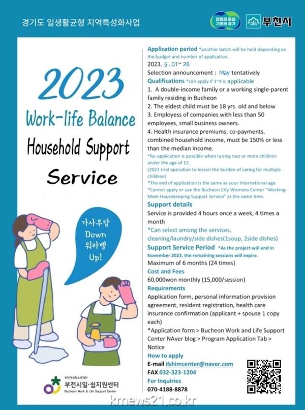 □ 부천시 일·쉼지원센터(운영법인:부천시여성청소년재단)는 경기도 일생활균형 지역특성화 사업의 일환으로 ‘워라밸 가사지원서비스’를 운영하고 있다.