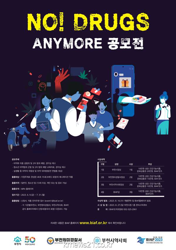 제25회 부천국제애니메이션페스티벌(이하 BIAF2023)이 부천시, 부천원미경찰서, 부천시약사회와 함께 주최하는 마약류 이용 범죄 근절 애니메이션공모전 “NO! DRUGS ANYMORE 공모전”을 개최한다.