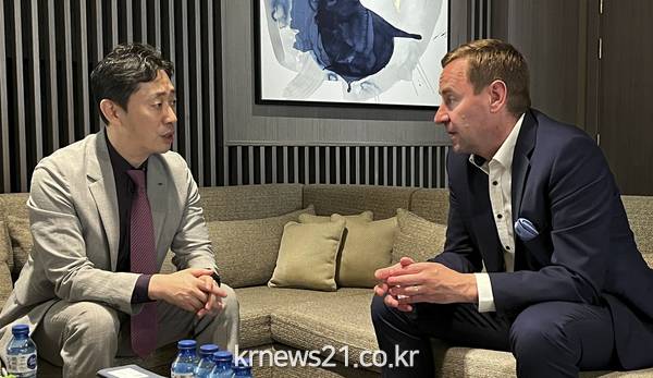 2. 윤형중 한국공항공사 사장(왼쪽)이 킴모 마키 핀란드 공항공사 CEO(오른쪽)와 부산-헬싱키 노선의 운항개시를 위한 협력방안을 논의하고 있다.