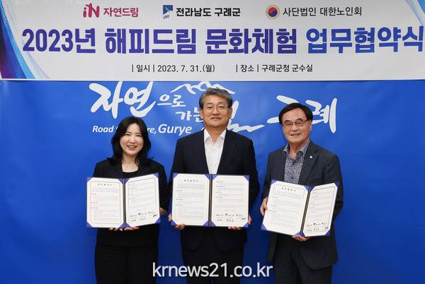 ▲ 구례군, 2023년 해피드림 문화 체험 업무협약 체결전남 구례군은 7월 31일 군청 군수실에서 구례자연드림파크(본부장 김도희), (사)대한노인회구례군지회(회장 손병관)와‘2023년 해피드림 문화 체험’업무협약을 체결했다고 밝혔다.