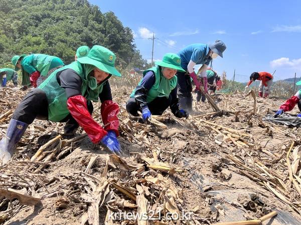 자원봉사자와 직원 등 40여 명은 최근 충청북도 괴산군 감물면 일대를 찾아 침수된 옥수수밭과 농경지 복구를 위한 구슬땀을 흘렸다. 이들은 땡볕이 내리쬐는 가운데 옥수수밭 약 6,000여㎡를 돌며 부유물을 제거하는 등 침수시설을 정비했다.