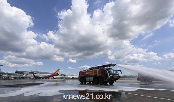 이날 서울 김포공항의 낮 최고기온이 36℃로 예보된 가운데 공사는 특수살수차량과 소방차를 동원해 계류장 등 이동지역의 온도를 낮추기 위한 살수작업을 진행했다.