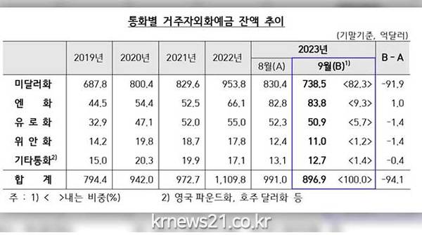 한국은행이 오늘(24일) 발표한 '9월 중 거주자 외화예금 동향' 자료를 보면 지난달 말 기준 외국환은행의 거주자외화예금 잔액은 896억 9,000만 달러로 8월 말보다 94억 1,000만 달러 감소했다.