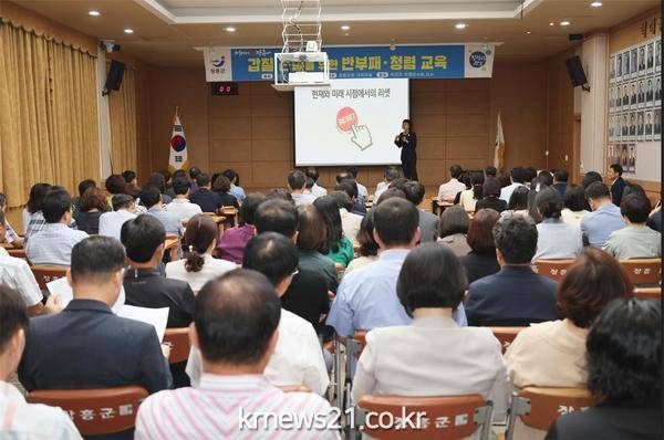 장흥군은 5일 군청 대회의실에서 부서장과 팀장급 이상 직원들을 대상으로 갑질근절을 위한 반부패 청렴 교육을 실시했다고 전했다.