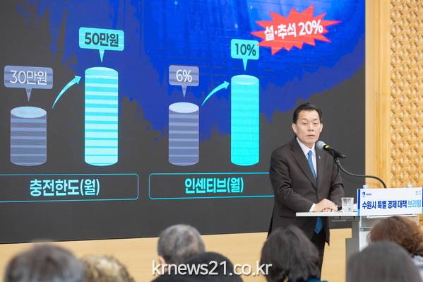 이재준 시장은 18일 시청 중회의실에서 ‘특별 경제대책 브리핑’을 열고, “내년 수원페이에 411억 원의 예산을 편성하겠다”며 “수원페이 확대에 따른 매출 효과는 5200억 원을 상회할 것으로 분석되고, 신규 소비도 늘어나 지역경제에 온기를 불어넣을 것”이라고 밝혔다.