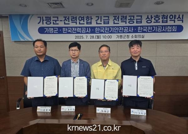 가평군 관계자는 “이번 협약을 통해 공공기관과 민간단체가 협력해 침수 피해 주민들의 전력 복구를 신속히 지원해 주민들의 불편이 하루라도 빨리 해소되기를 바란다”며 “마지막 한 가구까지 전기가 공급돼 하루빨리 예전의 일상으로 돌아갈 수 있도록 최선을 다하겠다”고 말했다.