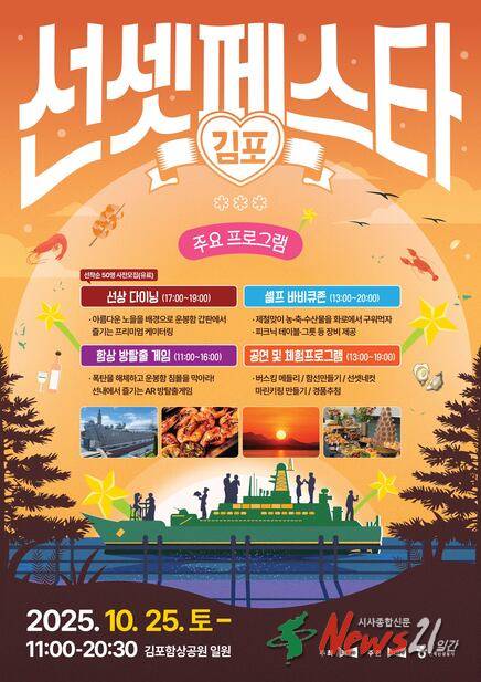 아름다운 석양을 배경으로 선상 다이닝을 즐길 수 있는 특별한 축제가 김포에서 열린다. 오는 25일 단 하루, 토요일 오전 11시부터 밤 8시 30분까지 대곶면 김포함상공원 일원에서 ‘2025 김포 선셋 페스타 with 로컬푸드 다이닝’이 개최된다.