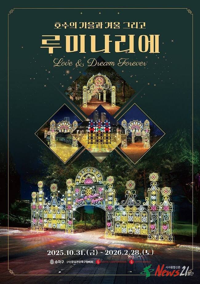 먼저, 석촌호수 동호 입구 금빛과 핑크빛으로 가득 채운 ‘루미나리에 메인 게이트’가 관람객들을 빛의 세계로 초대한다. 이어, 지난해보다 길어진 ‘루미나리에 터널’과 화려한 ‘중형 게이트’가 마치 빛의 시간을 걷는 듯한 황홀함을 선사한다.