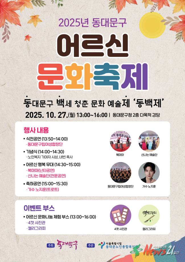이번 축제는 지역 어르신들에게 다양한 공연과 문화 체험의 기회를 제공하기 위해 마련된 자리로, 동대문노인종합복지관(관장 김윤태)이 주관한다. 행사에는 관내 어르신 및 지역주민 등 800여 명이 참여할 예정이다.