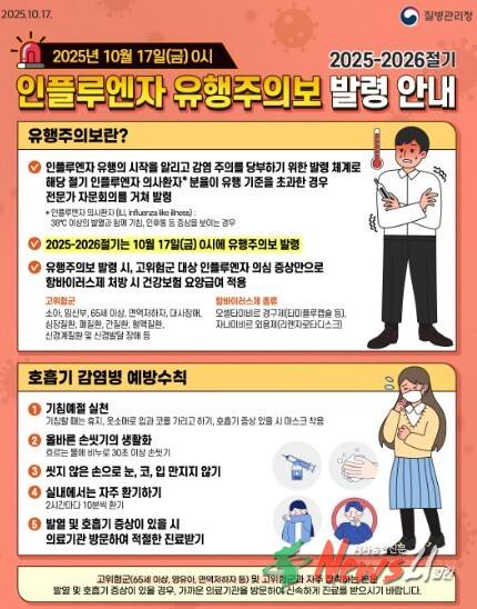 군은 질병관리청이 이달 17일 ‘2025~2026절기 인플루엔자 유행주의보’를 발령함에 따라, 호흡기 감염병 확산을 막기 위한 예방접종과 개인 위생수칙 준수를 적극 권고하고 있다. 인플루엔자는 기침이나 콧물 등 호흡기 분비물을 통해 전파되며, 고열과 인후통, 근육통 등을 동반한다. 특히 고령자, 임신부, 만성질환자 등 고위험군은 폐렴 등 합병증 위험이 높아 조기 접종이 무엇보다 중요하다.