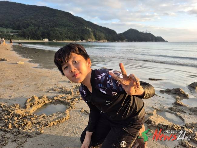 해변에서 갯벌 체험 중인 아이들은 즐겁기만 하다.