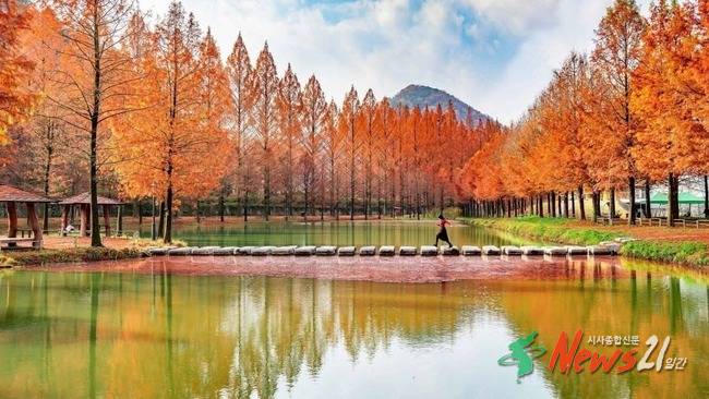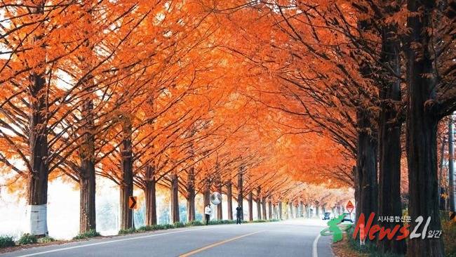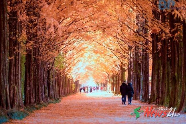 대나무숲 외에도 메타세쿼이아라는 가로수가 심어져 있어서 이국적이며 환상적인 풍경을 만들고 있다. 멀리서 보면 옹기종기 줄을 서서 모여 앉은 요정들 같기도 하고 장난감 나라의 꼬마열차 같기도 하다. 길 가운데에서 쳐다보면 영락없는 영국 근위병들이 사열하는 모습이다. 질서정연하게 사열하면서 외지인들에게 손을 흔들어준다. 이 길을 가다 보면 이국적인 풍경에 심취해 나도 모르는 사이에 남도의 길목으로 빠져들고 만다. 메타세쿼이아 가로수길은 1972년 담양군(제19대, 김기회 군수)에서 국도 24호선, 군청~금성면 원율삼거리 5㎞ 구간에 5년생 1,300본을 식재하여 조성한 길이다.