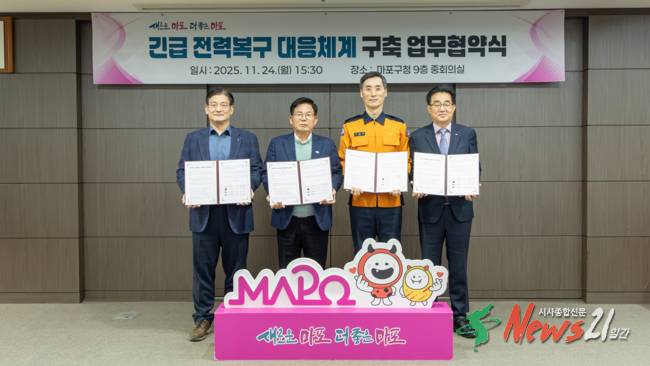 ▲ 사진=마포구청마포구(구청장 박강수)는 11월 24일 오후 3시 30분, 마포구청 9층 중회의실에서 마포소방서, 한국전력공사 마포용산지사, 한국전기안전공사 서울본부와 함께 ‘전력복구 대응 체계 구축을 위한 업무협약’을 체결했다.