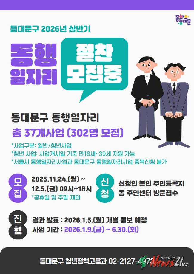 ▲ 사진=동대문구청서울 동대문구(구청장 이필형)는 11월 24일부터 12월 5일까지 ‘2026년 상반기 동대문구 동행일자리사업’ 참여자 302명을 모집한다.