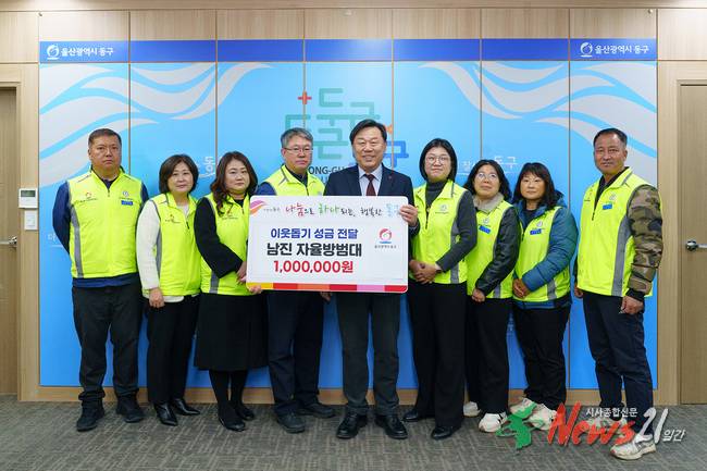 남진 자율방범대(대장 강경균)는 12월 3일 오후 5시 20분 울산 동구청을 방문하여 어려운 이웃을 위해 써달라며 이웃돕기 일일 호프 수익금 100만 원을 전달하였다.