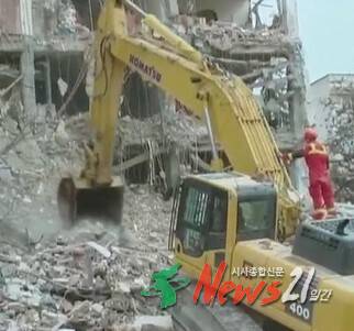 ▲ 사진=KBS뉴스영상캡쳐폭격을 맞은 건물 일부가 붕괴되고 콘크리트 잔해가 현장에 쌓여 있다.