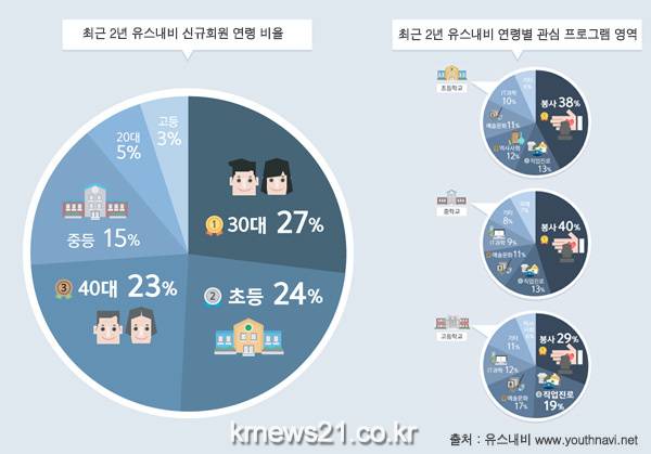 서울시 아동청소년 체험정보에 관심을 보이며 유스내비에 가입 한 신규회원 연령 비율은 30대 27%, 초등연령이 24%, 40대 3%, 중등연령 15% 순으로 나타났다.