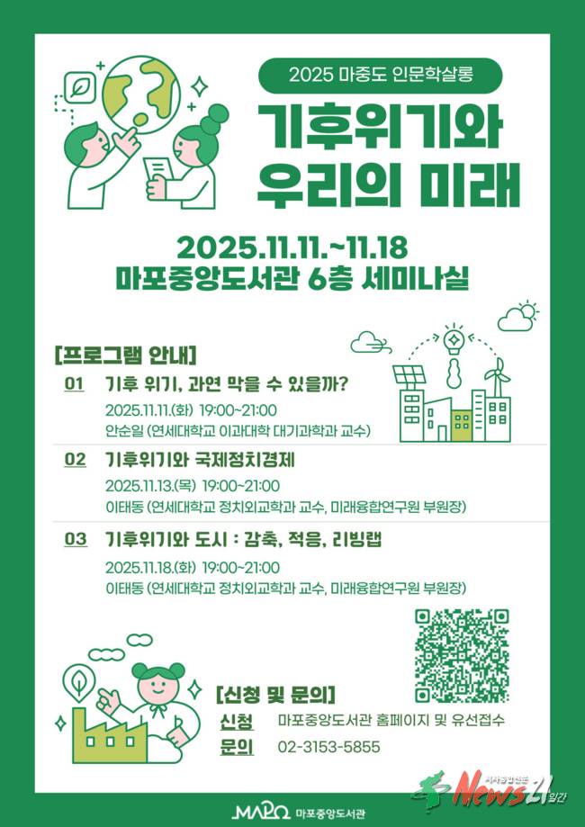 한편 마포중앙도서관에서는 같은 달 11월 11일부터 18일까지 ‘기후 위기와 우리의 미래’를 주제로 ‘하반기 마중도 인문학 살롱’을 운영한다.