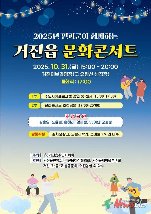 ▲ 사진=고성군거진읍 주민자치회는 오는 10월 31일(금) 오후 3시부터 8시까지 거진 타보라 광장(구 유람선 선착장, 미화횟집 앞 주차장)에서 ‘2025년 민과 군이 함께하는 거진읍 문화콘서트’를 개최한다.