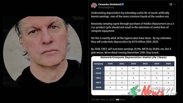 버리는 현지 시각 10일 소셜미디어 엑스(X)에 올린 글에서 클라우드·인공지능(AI) 인프라 제공업체인 ‘하이퍼스케일러’들이 실제보다 칩의 감가상각 비용을 축소하고 있다고 주장했다고 CNBC가 11일 보도했다.