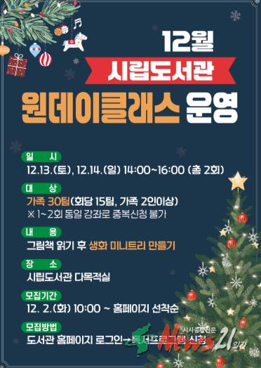 이번 프로그램은 12월 13일, 14일 오후 2시부터 4시까지 진행되며, 2인 이상 가족 30팀을 대상으로 한다. 두 차수 모두 동일한 내용으로 진행되며, 중복 참여는 불가하다.
