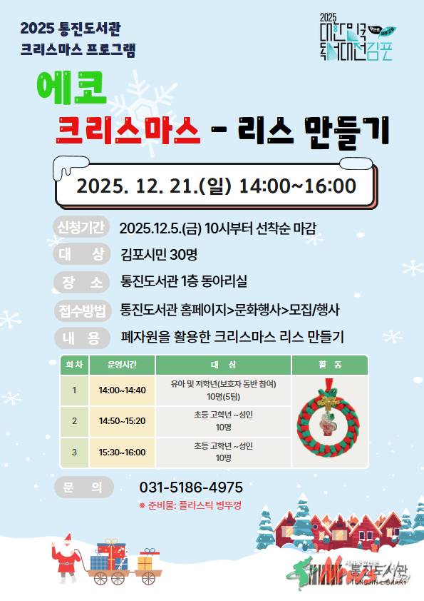 ‘에코 크리스마스 리스만들기’는 12월 21일(일) 오후 2시부터 연령대별로 총 3회차로 나뉘어 통진도서관 1층 문화교실에서 진행되며, 참여 신청은 12월 5일(금) 오전 10시부터 통진도서관 홈페이지 문화행사 신청(모집/행사)페이지에서 김포시민 30명을 선착순 모집한다.