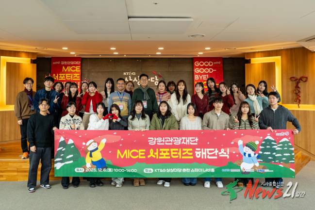 올해 서포터즈 모집에는 총 40명이 지원해 25명이 최종 선발, 전원 수료했다. 참여 학생들은 강원 지역 MICE 행사 운영 지원, 홍보 콘텐츠 제작, 현장 실습 등을 통해 실무 경험을 축적했다. 해단식에는 서포터즈 25명과 강원대학교 대학일자리플러스센터, 강원관광재단 관계자 등 총 34명이 참석했다.