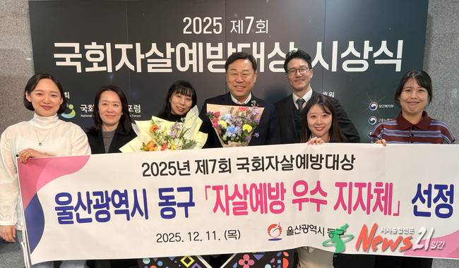 울산광역시 동구(구청장 김종훈)는 12월 11일 오후 3시 국회의원회관 대회의실에서 열린 ‘2025년 제7회 국회 자살예방 대상’ 시상식에서 자살 예방 우수 지자체 상을 받는 영예를 안았다.