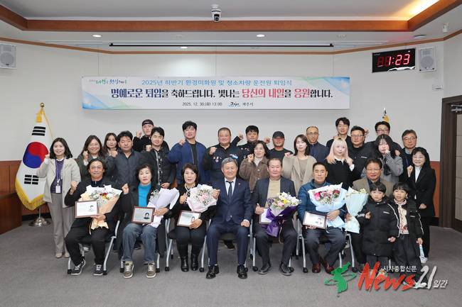 제주시는 지난 30일(화) 시청 본관 회의실에서 정년을 맞아 명예롭게 퇴직하는 환경미화원 등 9명의 퇴임식을 개최했다.