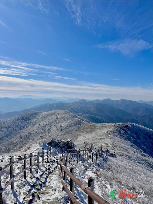덕유산은 전라북도 무주군과 경상남도 거창·함양군에 걸쳐 있는 해발 1,614m의 산이다. 주봉인 향적봉을 중심으로 능선이 길게 이어지는 것이 특징이다. 덕유산 국립공원으로 지정돼 구상나무 군락과 다양한 고산 식생이 분포한다. 겨울에는 상고대와 설경이 아름다워 대표적인 겨울 산행지로 꼽힌다. 무주리조트가 인접해 사계절 관광과 레저 명소로도 알려져 있다.