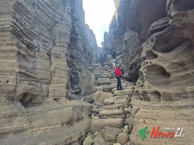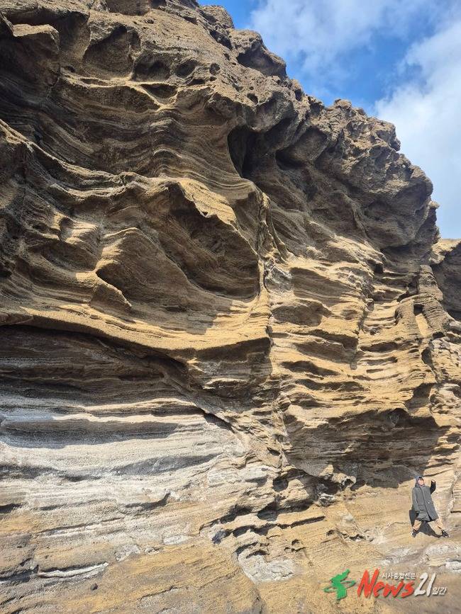 사암과 화산재층이 겹겹이 쌓인 독특한 지형으로 지질학적 가치가 높다.