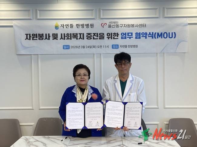 (사)울산동구자원봉사센터(이사장 이순자)와 자연뜰한방병원(병원장 김호채)은 3월 24일 자연뜰한방병원에서 지역사회 자원봉사 활성화와 복지증진을 위한 업무협약(MOU)을 체결했다.