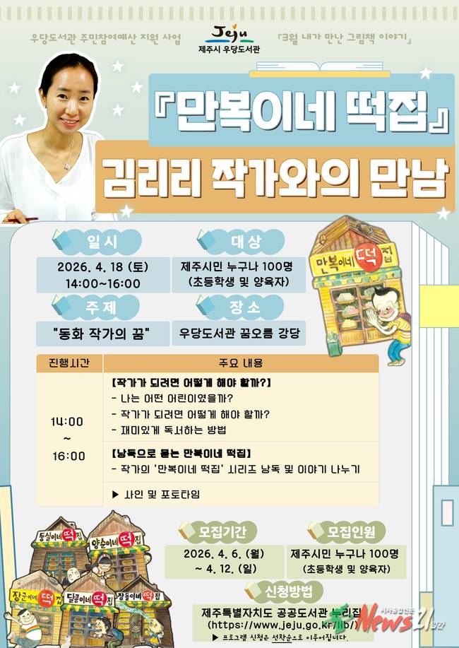 ▲ 사진=제주시 우당도서관은 ‘책보고’ 도서대출서비스 연계 사업의 일환으로 오는 4월 18일(토) 오후 2시 꿈오름 강당에서 김리리 작가 초청 강연을 개최한다.