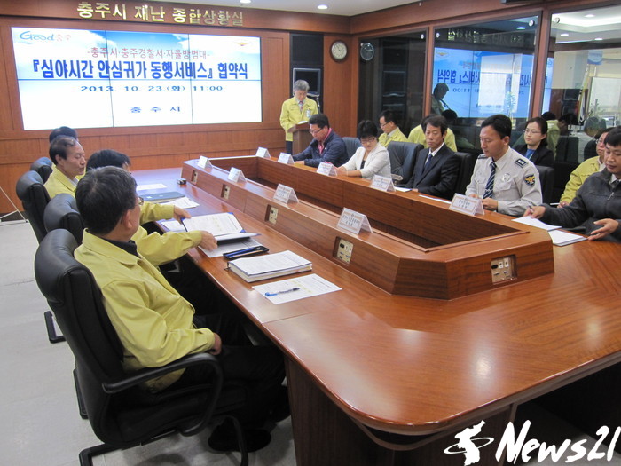 시에 따르면 지난 23일 오전 11시 시청 재난종합상황실에서 충주시 · 충주경찰서 · 충주시 자율방범대가 여성들의 ‘심야시간 안심귀가 동행서비스’를 위한 업무협약식을 체결했다고 밝혔다.