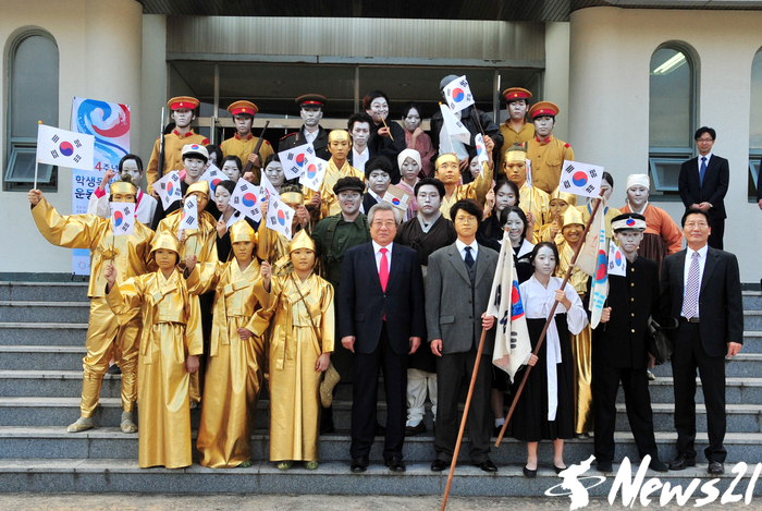 행사장 앞에는 항일 독립 운동사를 빛낸 김구, 안중근 등의 인간조각 퍼포먼스가 전시됐다.