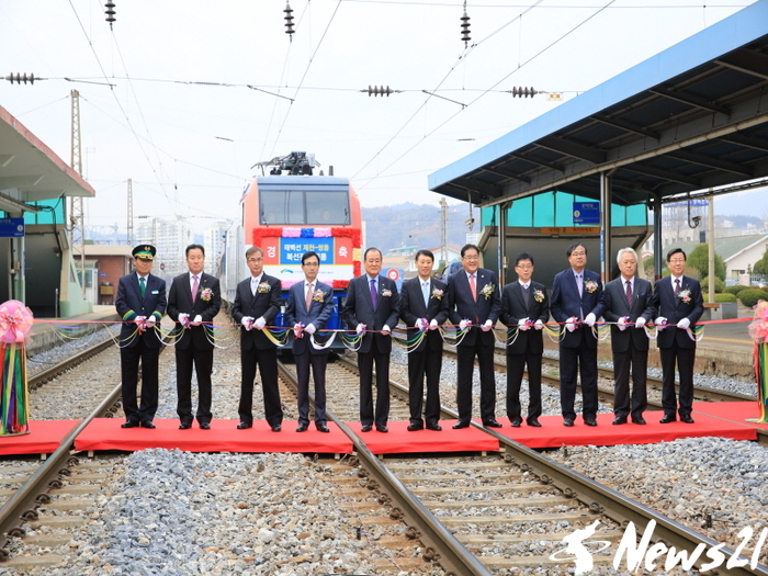 이를 축하하는 개통식이 14일 충북 제천시 제천역 광장에서 제천·단양 지역구인 송광호 새누리당 의원을 비롯해 신진선 충북도 행정부지사, 최명현 제천시장, 김광재 철도시설공단 이사장, 국토교통부 관계자 등 주요인사와 지역주민 등 200여명 참석한 가운데 열렸다.