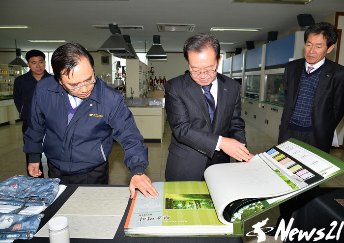 | ▲ 이종배 충주시장이 중원산업단지 내에 소재한 (주)대원포리머를 방문하여 기중선 대표로 부터 회사 상품을 설명 듣고 있다. (사진제공=충주시청) | |