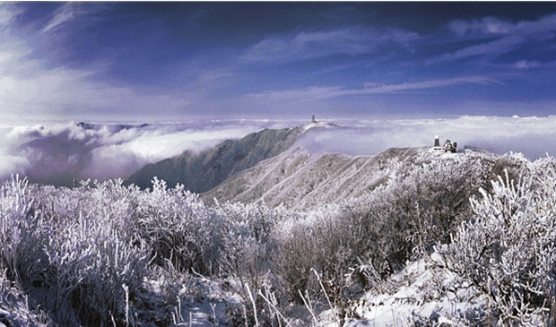 바다의 산호초를 연상케 하는 순백의 상고대는 습도와 기온차이로 생기는데 전국의 명산 중에서도 단양 소백산이 특히 아름답다.