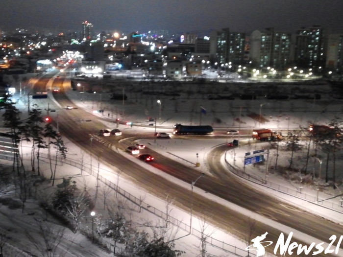 | ▲ 12일 8시 현재 충북 지방중 가장많은 적설량을 보인 제천 차량들이 거북이 처럼 운행을 하고 있다. © 남기봉=기자 | |