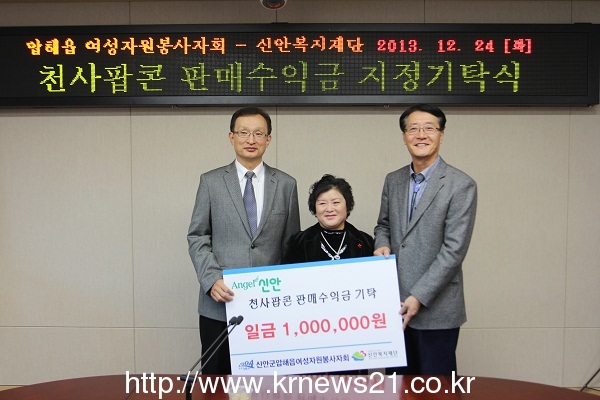 압해읍여성자원봉사자회(회장 이경애)는 24일 현재 압해읍에 거주하고 있는 어려운 이웃을 위해 써달라며 “천사팝콘” 판매 수익금 100만원을 신안복지재단에 기탁하였다.