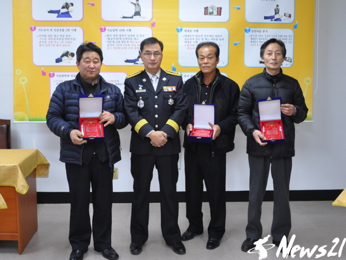 제천소방서(서장 김선관)가 17일 오전 제천소방서 2층 회의실에서 역전시장 상인회 전태섭(57)씨 등 상인 3명에게 화재진압 유공자 감사패를 수여했다.